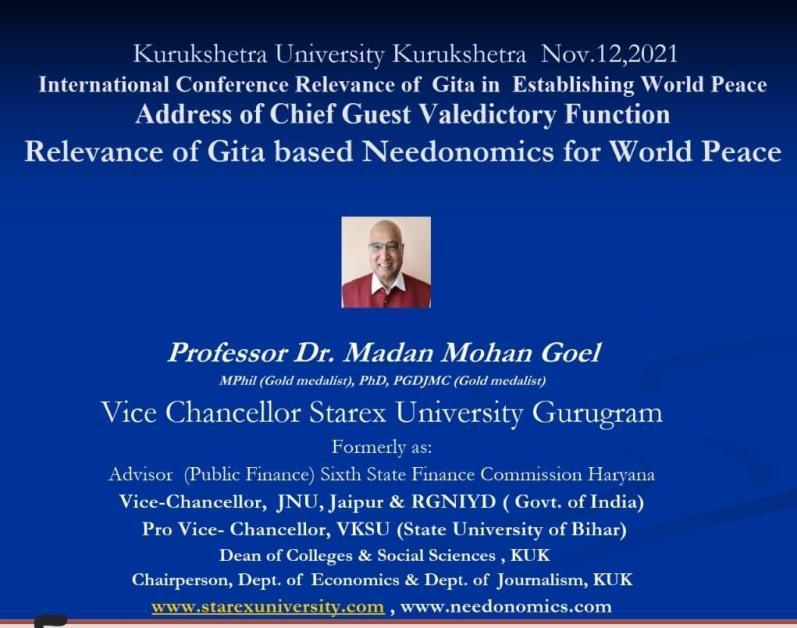 World peace requires the adoption of Gita based needonomics with no to greed: VC Starex University MM. Goel November 12, 2021 KRC TIMES Education Desk