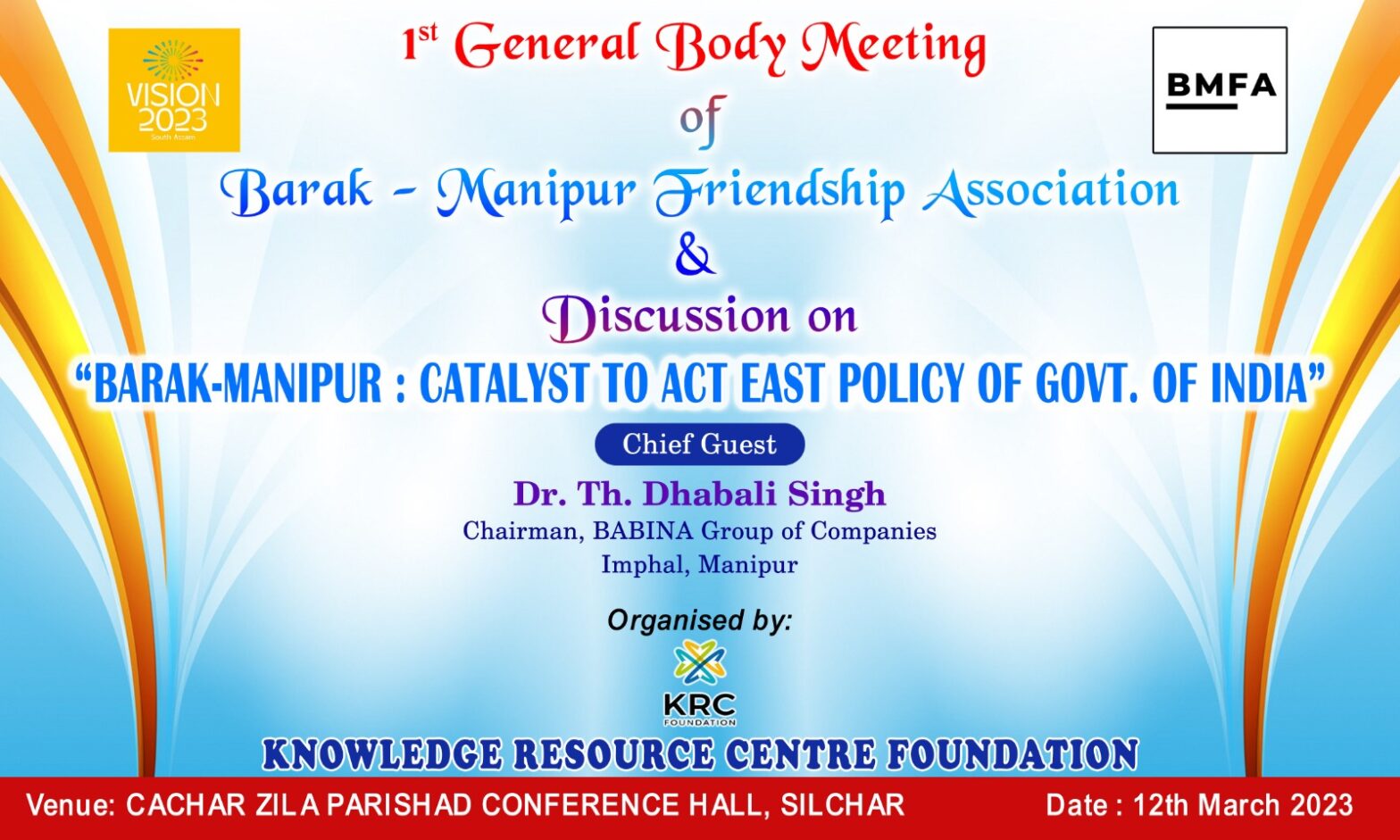 KRC Foundation to hold interactive session in Silchar on ‘Barak-Manipur Catalyst To Act East Policy of Government of India’ March 11, 2023 KRC TIMES Desk