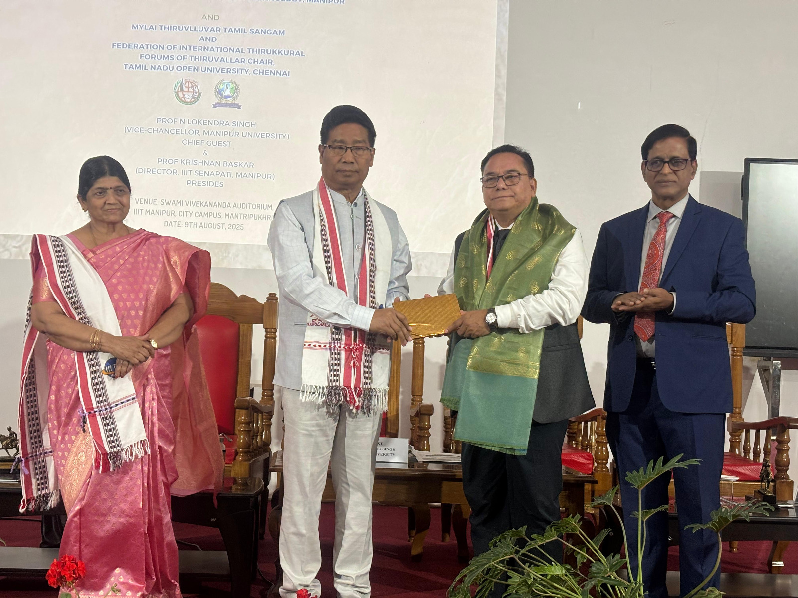 The award was presented on Saturday, August 9, 2025, at the Swamy Vivekananda Auditorium, IIIT Mantripukhri, Imphal, by Professor N. Lokendra Singh, Vice Chancellor of Manipur University, in the presence of Dr. N. Murugan, Founder Chairman of Thiruvalluvar, and Prof. Krishnan Baskar, Director of IIIT, Manipur.