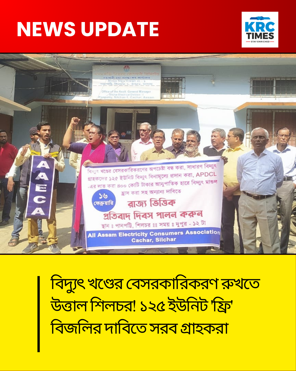 বিদ্যুৎ খণ্ডের বেসরকারিকরণ রুখতে উত্তাল শিলচর! ১২৫ ইউনিট ‘ফ্রি’ বিজলির দাবিতে সরব গ্রাহকরা ফেব্রুয়ারি ১৭, ২০২৬ কেআরসি টাইমস বারাক ভ্যালি ব্যুরো