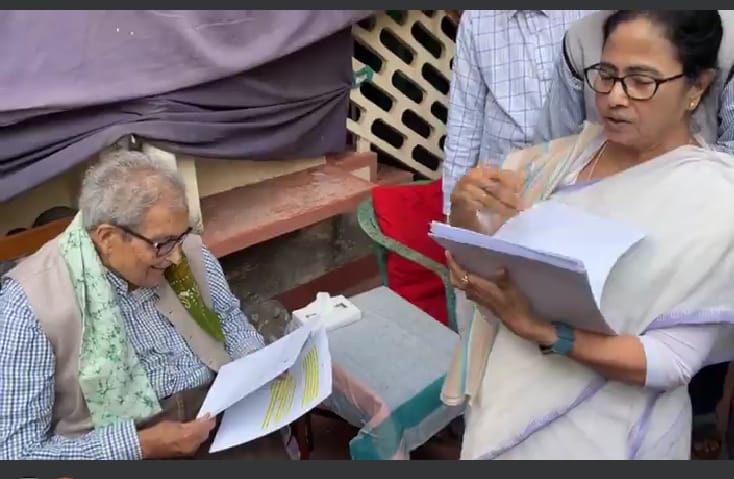 পশ্চিমবঙ্গের মুখ্যমন্ত্রী মমতা ব্যানার্জি মঙ্গলবার নোবেল পুরস্কার বিজয়ী অমর্ত্য সেনের শান্তিনিকেতনের বাড়িতে গিয়ে তার সঙ্গে দেখা করেন জানুয়ারি ৩১, ২০২৩ প্রকৃতি নিউজ কনসার্ন