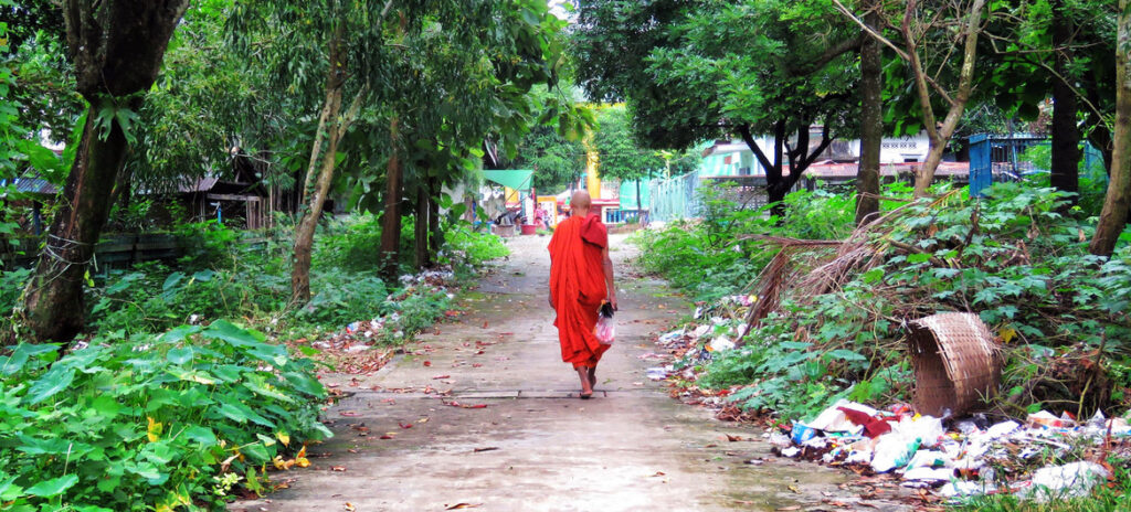 A monk walks toward a pagoda temple near Yangon, Myanmar.