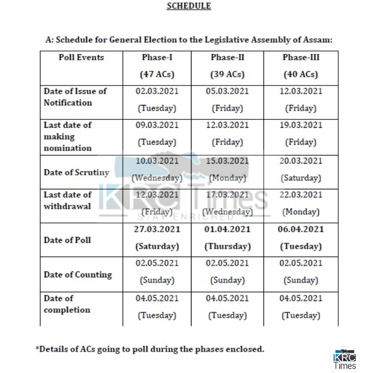 The first phase of the Poll for 47 Assembly Constituencies (ACs) will be held on 27th March 2021 (Saturday); 2nd Phase poll for 39 ACs will be held on 1st April 2021 (Thursday) and the 3rd phase of the poll for 40 ACs will be held on 6th April (Tuesday). Counting of Vote will be on 2nd May 2021 (Sunday) along with other states.