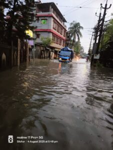 Silchar: A fresh spell of intense monsoon rainfall on Monday morning plunged several parts of Silchar into chaos, with extensive waterlogging and artificial flooding bringing life to a near standstill. The deluge disrupted vehicular movement, inundated homes and markets, and intensified the ongoing flood crisis in Assam’s Barak Valley.