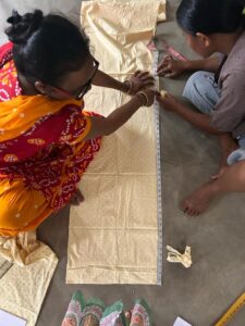 In the first batch three Karbi women – Kareng Rongpipi, Larlyn Engtipi, and Sanjina Engtipi from Kohora River Basin Area, and Difloo River Basin — joined the advance training workshop. It began with a refresher on how to take care of the machine, measurement rules, and drawing the measurement on chart paper. By the end of the second day, the team had moved on to cutting cloth and stitching blouses. As the week progressed, the women added more layers of designs.
