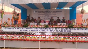 A total of 1,179 members of the two rebel groups surrendered on Monday after nearly six years of negotiations with the government. Among them, BRAU has 634 active members and UDLA has 545 active members. They surrendered their used AK47s and various sophisticated weapons. A thousand and more cadres of the two rebel groups surrendered today in the presence of Speaker of the Assam Legislative Assembly Biswajit Daimari and Minister Piyush Hazarika on the grounds of Charles March Higher Secondary School of Katlichhara in Hailakandi district of Assam.