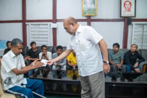 Organized by the Manipur Building and Other Construction Worker’s Welfare Board, Chief Minister N Biren Singh has provided Rs. 5000 each to each beneficiaries .Speaking on the occasion, the CM said that the scheme is for the education of children to every family having a valid labour card and staying in the relief camps set up by the Government of Manipur.