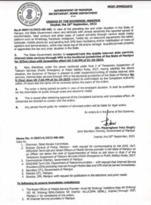 Imphal: In view of the prevailing law and order situation in the state, the Manipur government suspended the mobile internet data services/internet, data services through VPN in the state for five days with immediate effect till 7:45 PM of October 1, 2023.