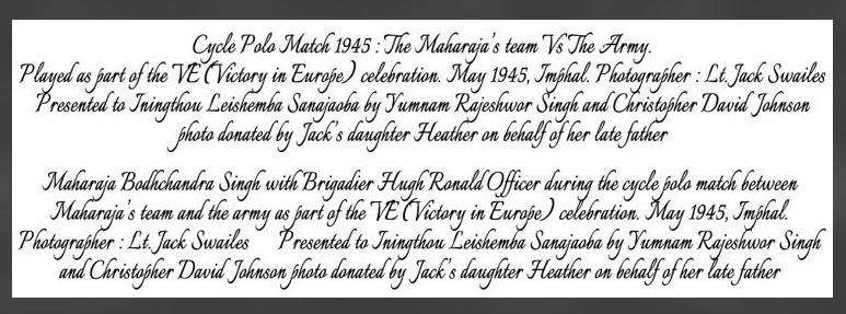 Jack Swailes was a Lieutenant in 137 GPT Company at Kanglatongbi for nearly two years when he took some photographs which have now become the rare photograph that could fill some of the historic voids of Manipur. The photograph of Cycle Polo taken by Jack Swailes was presented to the present Titular King of Manipur Maharaj Leishemba Sanajaoba on Thursday by Yumnam Rajeshwor Singh who is researching WWII and is the President of 2nd World War Imphal Campaign Foundation.