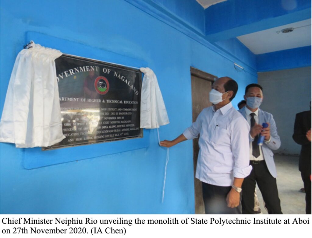 Chief Minister of Nagaland, Neiphiu Rio, inaugurated the State Polytechnic Institute and Multi Utility Cum Indoor Badminton Stadium in the present of Y. Patton, Deputy Chief Minister & Home; Temjen Imna Along, Minister Higher & Technical Education and Tribal Affairs; N Bongkhao Konyak Advisor, DUDA; N. Thongwang Konyak DPDB Chairman; Medo Yhokha Advisor to CM and Eshak Hessum, MLA 47th Aboi on 27th Novemberat Aboi Town.