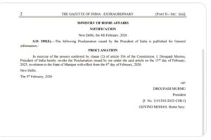 According to a notification issued by the Ministry of Home Affairs and published in The Gazette of India (Extraordinary), President Droupadi Murmu exercised powers under Clause (2) of Article 356 of the Constitution to withdraw the proclamation imposed on February 13, 2025. The revocation has come into effect from February 4, 2026.
