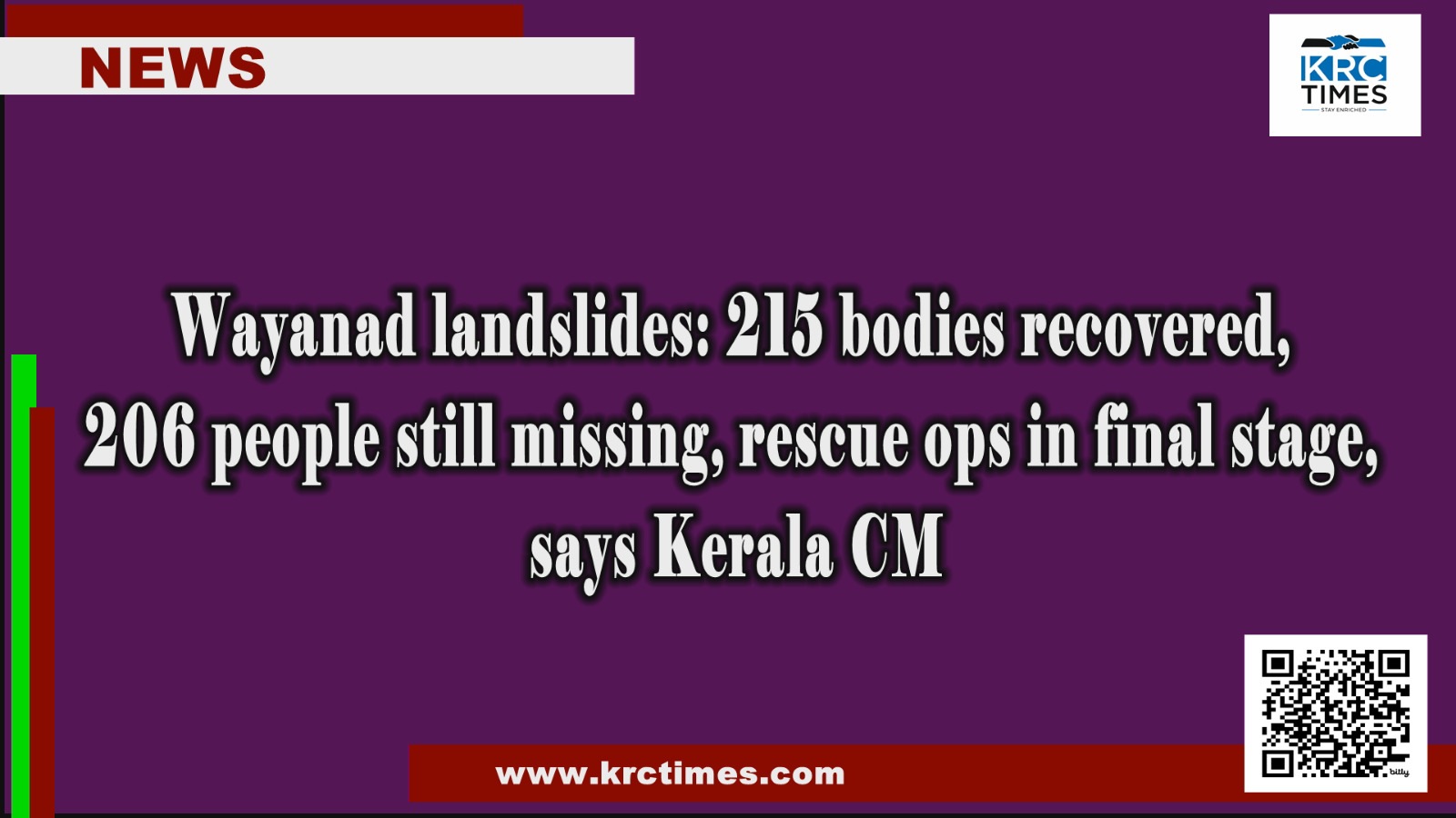 Thiruvananthapuram : Kerala Chief Minister Pinarayi Vijayan said that 215 bodies were recovered so far as rescue operations are in the final phase in landslides-hit Wayanad.