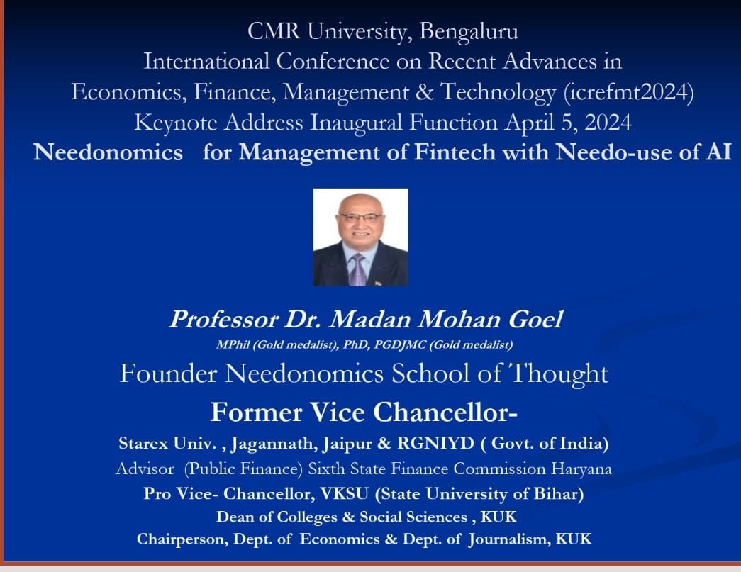 “For searching the solutions of prevailing socio-economic problems, we have to adopt Gita-based needonomics,” opined Professor M.M. Goel Vice-Chancellor Starex University Gurugam and Founder of  Needonomics School of Thought. He was addressing the participants of the International Conference on Ethics and Philosophy in Bhagavad-Gita jointly organised by Bhartiya Shikshan Mandal Haryana & CRSU Jind. He spoke on the topic “Gita based Needonomics for Atamnirbhar Bharat”.  Dr Pawan Kumar delivered a welcome address and presented a citation on the achievements of Prof. M.M. Goel.