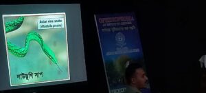 The highlight of the programme was the presentation by researchers on snakes. Presentations by Sumit Nath, Biswajit Singh, Shibam Sarkar. They discussed various practical aspects like distinction; poisonous and non-poisonous species available in the locality; the importance of snakes for the environment; various ways to protect ourselves from snakebites etc.