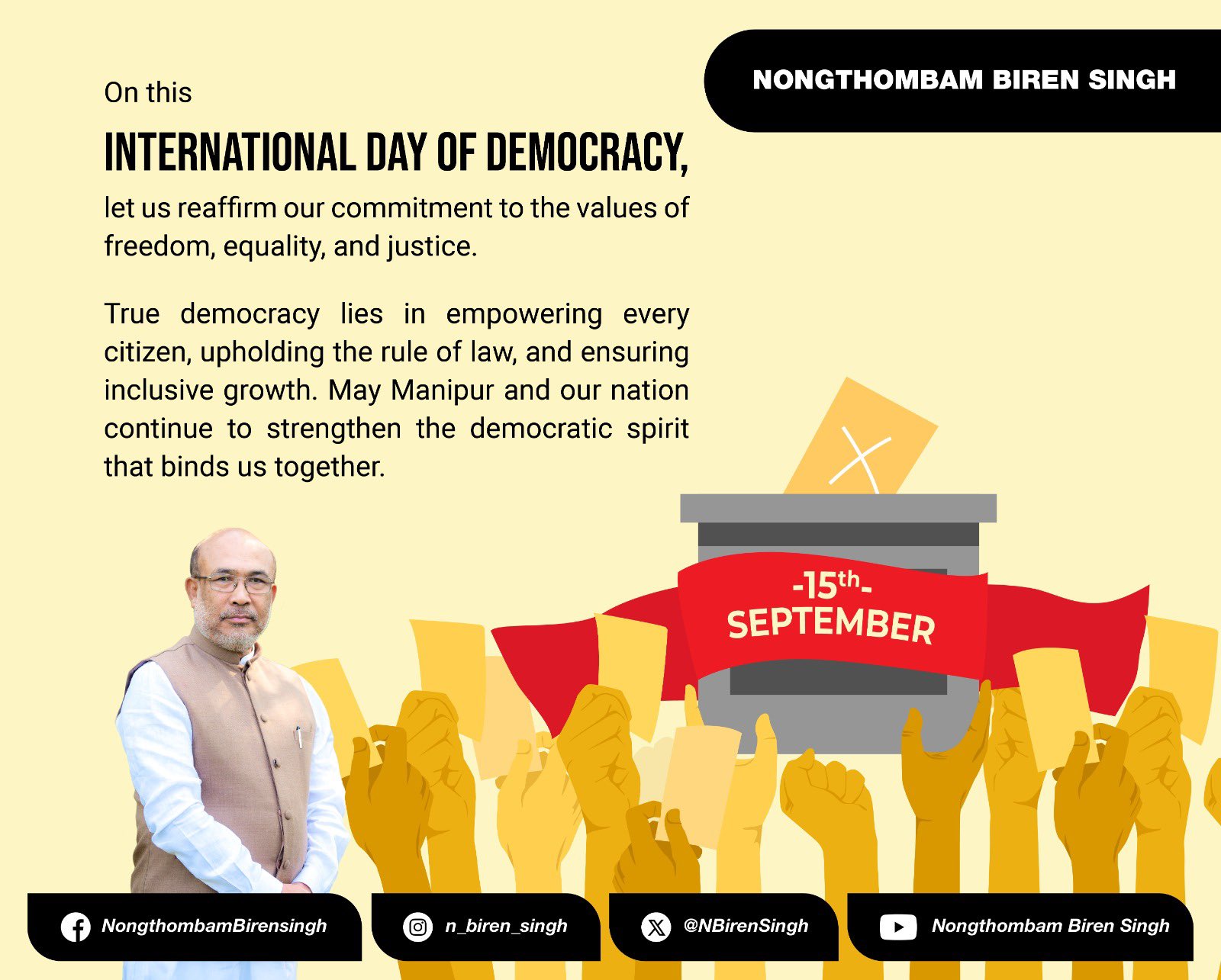 On this International Day of Democracy, let us reaffirm our commitment to the principles of equality, justice, and freedom. Together, we will strengthen democratic values and ensure that the voices of every citizen continue to shape the future of Manipur and our great nation. ~