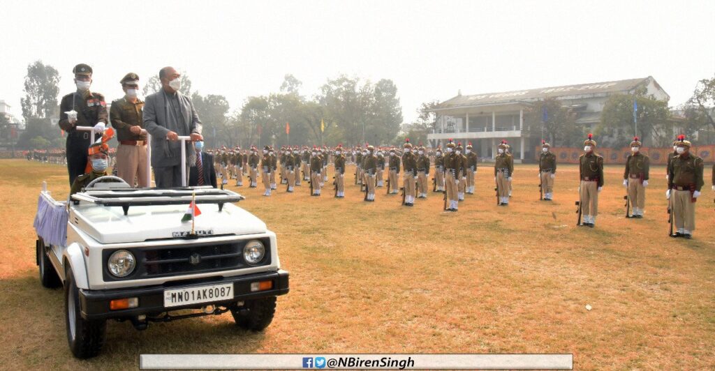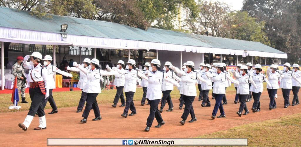 Jugeshore Sharma, Commanding Officer, 10th IRB was the parade commander of today’s march past contingents which includes 5th Battalion Manipur Rifles, Khongjaron; 8th IRB; Combined Civil Police (Male) Imphal East and West; 9th Indian Reserve Mahila Battalion; Home Guard (Male), Combined VDF, Imphal East and West; Traffic Police and CID-Technical and Bomb Squad contingent.