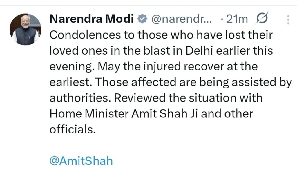 Condolences to those who have lost their loved ones in the blast in Delhi earlier this evening. May the injured recover at the earliest. Those affected are being assisted by authorities. Reviewed the situation with Home Minister Amit Shah Ji and other officials. @AmitShah
