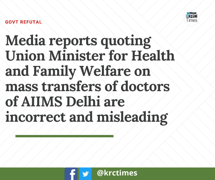 Media reports quoting Health Minister on mass transfers of doctors of AIIMS Delhi are incorrect and misleading September 26, 2021 KRC TIMES Desk